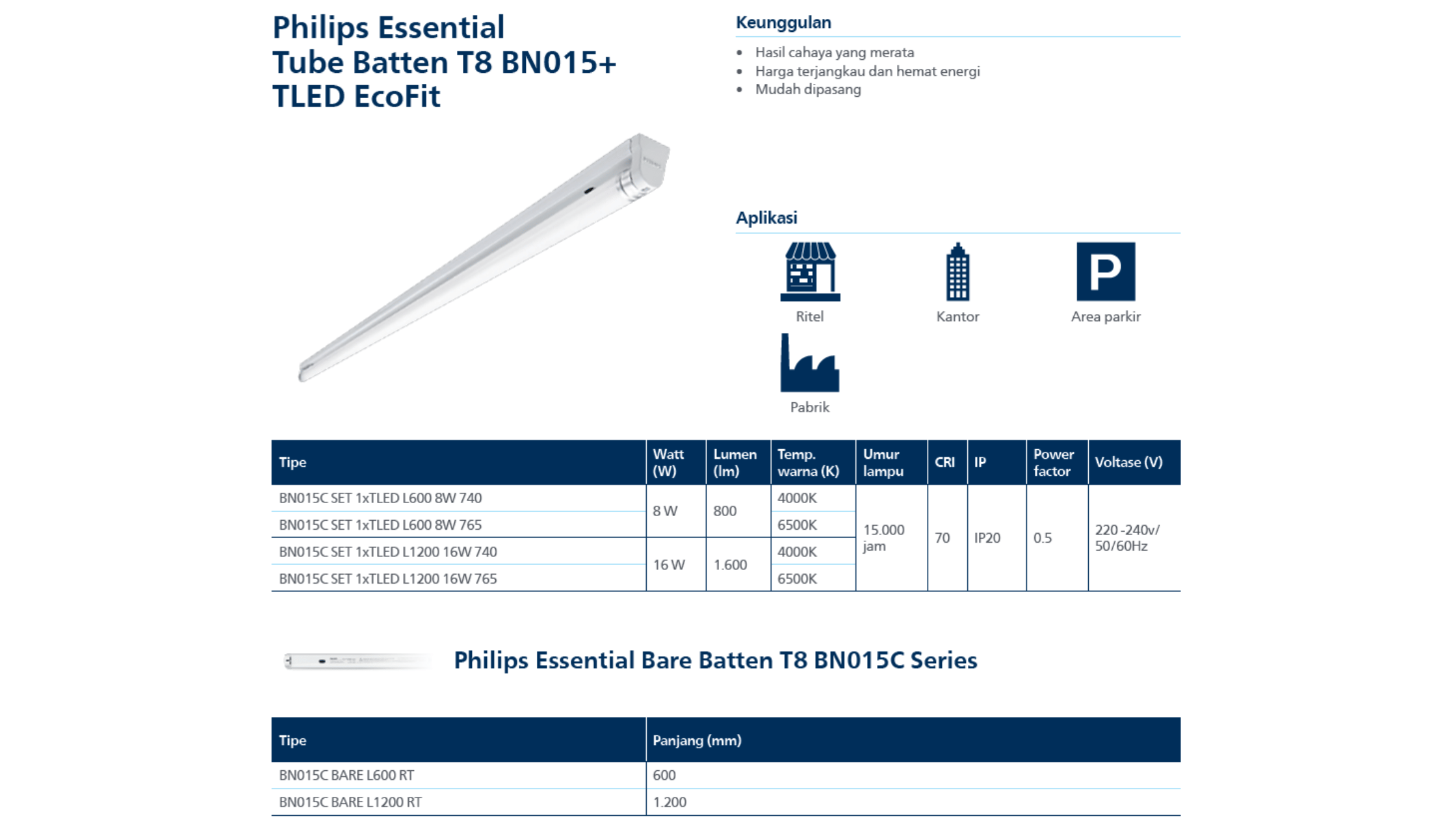 BN015C SET 1xTLED L600 8W 765 PHILIPS Lampu LED batten Philips BN015C set dengan TLED 8W panjang 600 mm yang memberikan pencahayaan terang, stabil, dan hemat energi. Menghasilkan cahaya 6500K (765) yang nyaman di mata dan cocok untuk berbagai kebutuhan pencahayaan ruangan. Armatur didesain ramping dan modern sehingga mudah dipasang serta cocok digunakan di ritel, kantor, area parkir, pabrik, maupun area kerja. Teknologi LED Philips juga membuat lampu lebih awet dengan konsumsi listrik yang lebih efisien dibanding lampu konvensional.