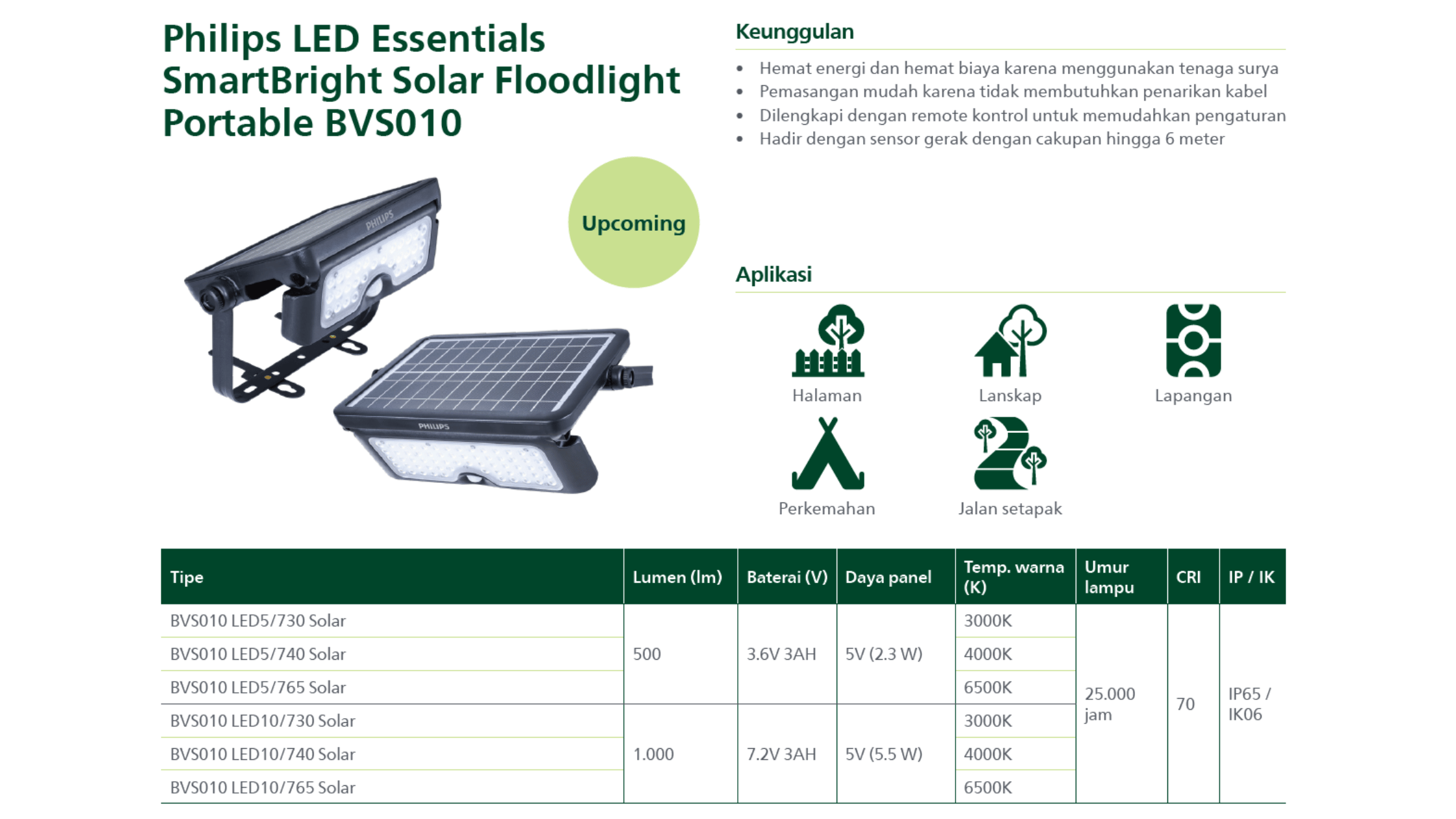 BVS010 LED5/765 Solar Philips adalah lampu outdoor tenaga surya yang hemat energi dan praktis tanpa instalasi listrik. Menggunakan teknologi LED dari Philips, lampu ini memberikan pencahayaan stabil dengan warna putih terang (6500K).