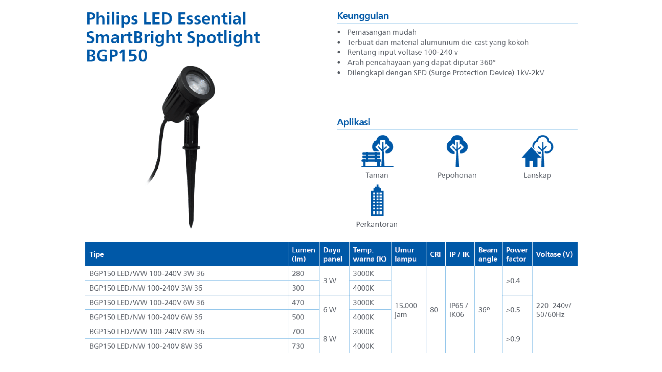 BGP150 LED/WW_NW 100-240V 3W 36 dari Philips adalah lampu LED hemat energi dengan konsumsi daya 3W dan pilihan warna cahaya warm white hingga neutral white. Dirancang untuk tegangan 100–240V, lampu ini cocok untuk pencahayaan dekoratif maupun aksen dengan distribusi cahaya merata dan umur pakai tahan lama. Aplikasi pemasangan untuk taman, pepohonan dan perkantoran.