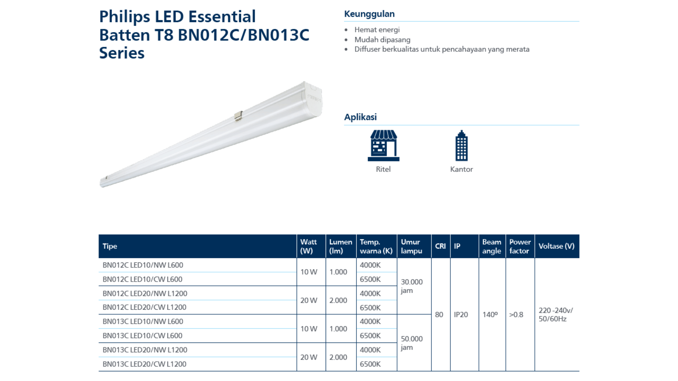 T8 Batten Philips BN013C LED10/NW L600 merupakan lampu LED batten hemat energi dengan cahaya neutral white yang nyaman di mata. Desain ramping, pemasangan mudah, dan tahan lama, menggunakan diffuser berkualitas untuk pencahayaan yang merata, cocok untuk ritel atau kantor.