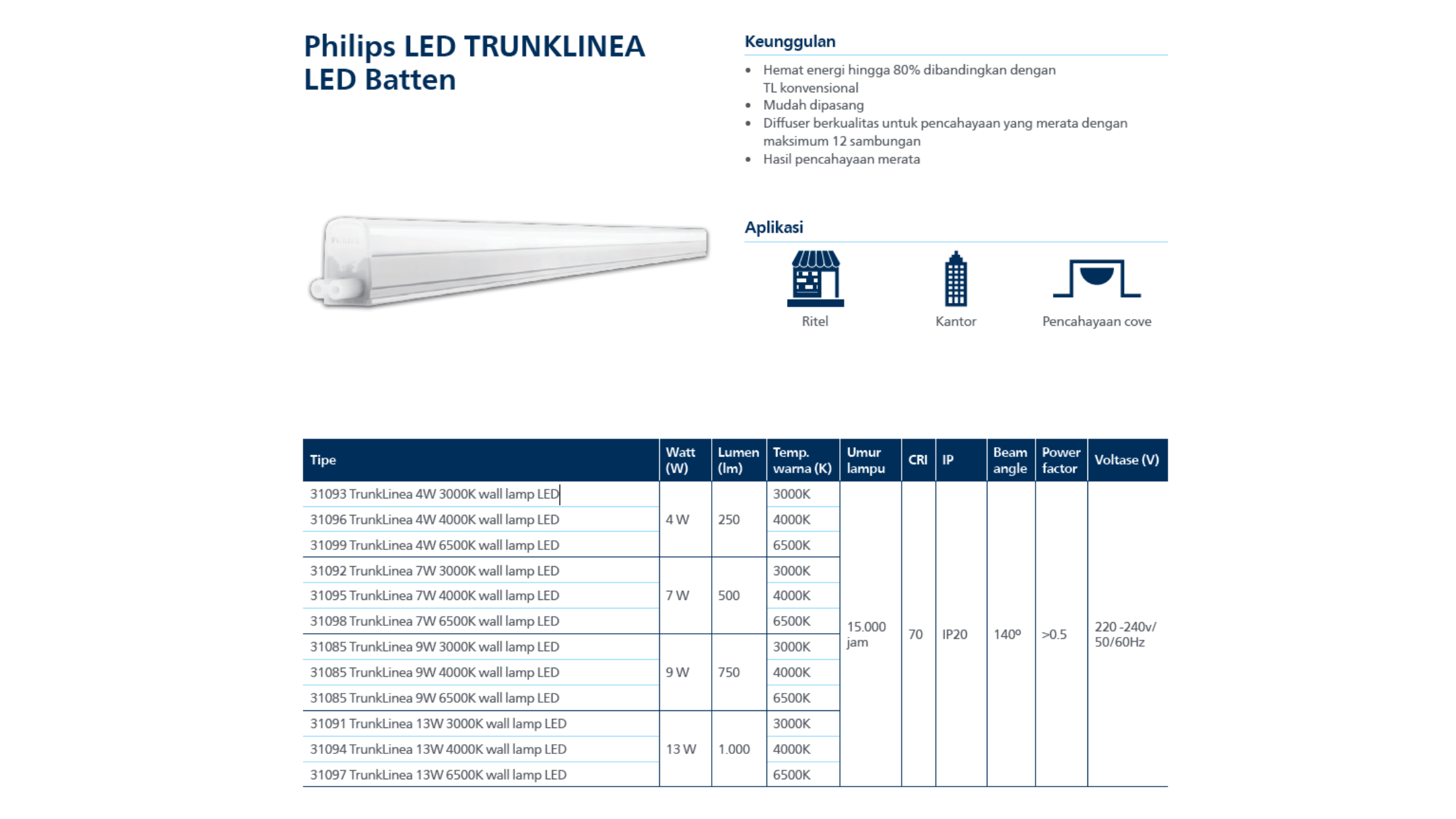 31091 TrunkLinea 13W 3000K wall lamp LED menghadirkan pencahayaan hangat dan nyaman dengan desain modern minimalis. Hemat energi, tahan lama, mudah dipasang dan dilengkapi diffuser berkualitas untuk pencahayaan yang merata dengan maksimum 12 sambungan. Cocok diaplikasikan untuk ritel, kantor dan pencahayaan cove.